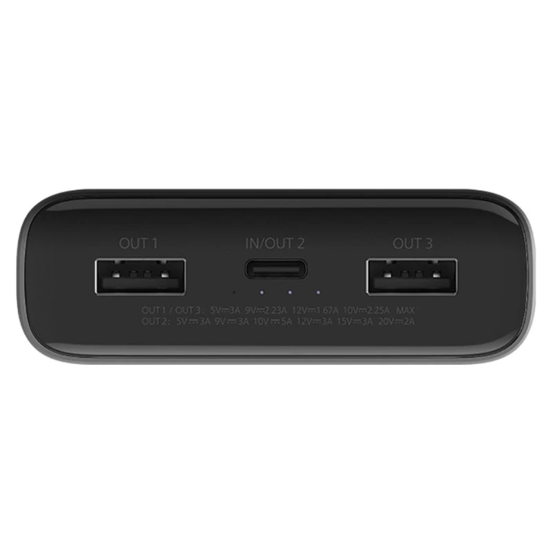 این پاوربانک مجهز به دو پورت USB-A و یک پورت USB-C است. پورت USB-C هم نقش ورودی و هم خروجی را دارد و به دلیل پشتیبانی از توان بالا، بهترین گزینه برای شارژ سریعترین دستگاهها به شمار میرود.